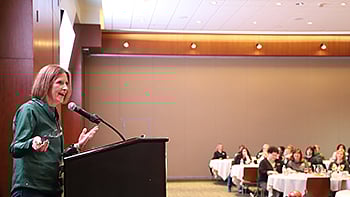 Maureen Jorgensen speaks to colleagues during Peoples State Bank’s annual President’s Day retreat. This particular retreat was held at Lambeau Field, thus the green and gold attire.